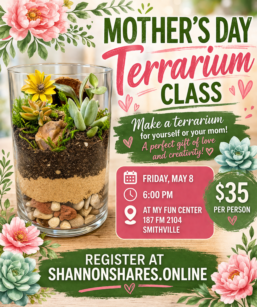 Join us for a joyful and hands-on Mother’s Day Terrarium workshop where creativity, nature, and connection come together. Treat yourself or your mom to a terrarium this year. A beautiful gift made with love, life, and creativity.